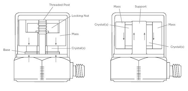 壓縮模式設(shè)計(jì)通過(guò)在壓電晶體頂部加載一個(gè)質(zhì)量塊并施加預(yù)載力以使壓電晶體受壓來(lái)實(shí)現(xiàn)。由于性能限制,此類(lèi)設(shè)計(jì)已經(jīng)過(guò)時(shí),不再那么流行。這類(lèi)結(jié)構(gòu)容易受到安裝基座應(yīng)變的影響,且具有較高的熱漂移。