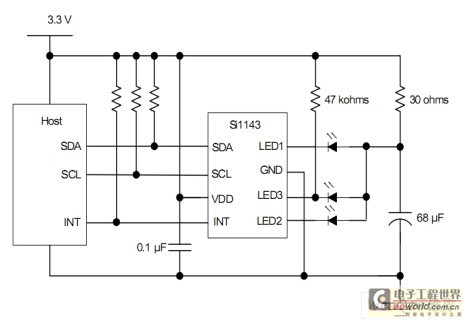與Si1120不同的是,Si1143帶了三個(gè)LED驅(qū)動(dòng),當(dāng)連接多個(gè)紅外LED時(shí),如果只有單個(gè)LED驅(qū)動(dòng)(如圖6所示),則需通過MCU來控制MOS管分時(shí)驅(qū)動(dòng)LED,而Si1143(如圖7所示)本身就已具備3個(gè)LED驅(qū)動(dòng),所以可以直接連接到不同的LED 引腳,勿需再另加外圍器件,為硬件設(shè)計(jì)節(jié)省了成本。另外,Si1143采用?SMBus接口,可兼容I2C通訊,通用性更強(qiáng),同時(shí)也方便軟件的設(shè)計(jì)。
