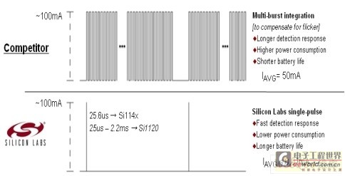 不像競(jìng)爭(zhēng)方案的紅外線LED必須長(zhǎng)時(shí)間進(jìn)行多次脈沖以達(dá)到精確的測(cè)量,Si1143紅外接近傳感系列使用專利的單一脈沖接近測(cè)量技術(shù)(如圖4所示),在電源效率上可達(dá)到5000倍的改善,電池壽命得以延長(zhǎng)。