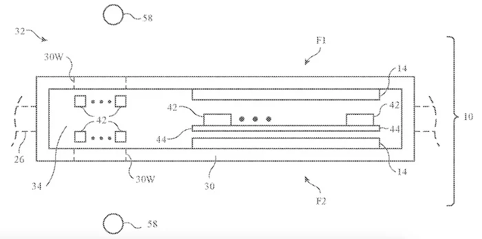 蘋(píng)果公司的紅外專利申請(qǐng)顯示了一個(gè)外殼的簡(jiǎn)單橫截面圖,其中包含諸如PCB(標(biāo)記為44),組件(標(biāo)記為42)和以窗口布置方式顯示的光學(xué)元件(標(biāo)記為30W)之類(lèi)的元件。