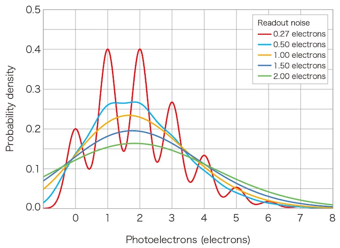 如下所示,對于 0.5 個電子及以上的讀出噪聲,將失去檢測單個光電子的能力。