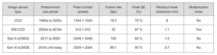 然而,從 2011 年開始,新一代 sCMOS 將 QE 提高了 72% - 82%,并將讀取噪聲降低到 sCMOS 在許多應(yīng)用中超過 CCD 的程度。新的技術(shù),即所謂的第三代 sCMOS,使 CCD/EM-CCD 圖像傳感器的能力完全相形見絀。