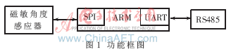 基于磁敏技術(shù)的位移傳感器主要由3個(gè)部分組成,前端角度信號(hào)采集、數(shù)據(jù)處理單元、數(shù)據(jù)通訊單元,具體的功能框圖如圖1所示。