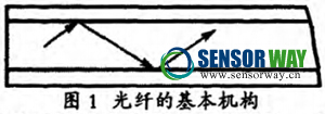 如圖1所示,光纖由高折射率的纖芯和包層兩部 分組成,纖芯的折射率大于包層的折射率,包層直徑 大致為0.1~0.2mm,光線通過(guò)端面透入纖芯,在與包 層的交界面處發(fā)生光線的完全內(nèi)反射,光線反射至纖 芯層,經(jīng)過(guò)不斷反射,光線沿著纖芯向前傳播。