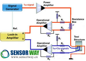 圖2 用于微孔膜測量的自適應(yīng)基于獨(dú)立型傳感器的3ω系統(tǒng),包含:信號發(fā)生器、鎖相放大器、前置放大器、運(yùn)算模塊(運(yùn)放、低溫漂電阻)及計(jì)算機(jī)自動控制系統(tǒng)。
