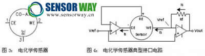 電化學(xué)式傳感器通常是電流方式輸出,信號的靈敏度從幾十nA/ppm到幾百nA/ppm,其數(shù)值根據(jù)氣體的種類不同而不同。另外,不同廠家的傳感器也略有差異。此類傳感器一般3個引腳,分別是工作電極(WE)/參考電極(RE)/對電極(CE)。 工作電極與對電極之間流動的電流與氣體濃度成比例。參考電極沒有電極流動,只是提供一個參考電壓。對于不同氣體傳感器,參考電壓會有所不同,設(shè)計后端電路時要仔細閱讀產(chǎn)品手冊。