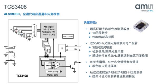 為了降低這一干擾,傳感器解決方案供應(yīng)商ams為我們帶來(lái)了全新的TCS3408顏色傳感器。它的靈敏度更高,可用于測(cè)量環(huán)境光的色溫和光強(qiáng),還可以檢測(cè)光學(xué)的物理閃爍,能讓手機(jī)攝像頭消除人造光源導(dǎo)致的照片缺陷。