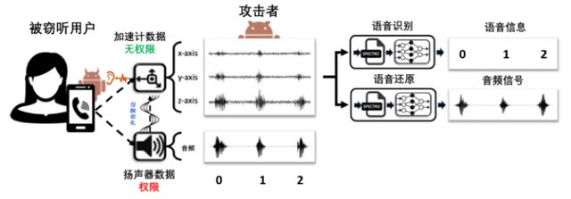“加速度傳感器是目前智能手機中最常見的一種嵌入式傳感器,主要用于探測手機本身的移動,常見的應(yīng)用場景包括移動檢測、步數(shù)統(tǒng)計、游戲控制等!比慰嬖V記者,它之所以能被用來監(jiān)聽電話,主要是由于智能手機本身的物理結(jié)構(gòu),“由于聲音信號是一種由震動產(chǎn)生的可以通過一些介質(zhì)進行傳播的聲波,因此手機揚聲器發(fā)出的聲音會引起手機的震動,而加速度傳感器可以準確感知到這些震動,因此攻擊者可以通過它來捕捉聲音信號引起的手機震動進而推斷出其中所包含的敏感信息。”