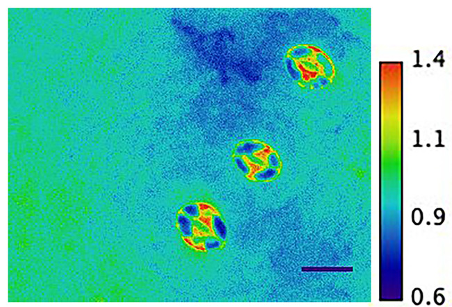 該圖像描繪了三個擬南芥葉表面的孔或氣孔,它們表達(dá)了由加州大學(xué)圣地亞哥分校的植物生物學(xué)家開發(fā)的新型SNACS應(yīng)力納米傳感器。圖片來源:圣地亞哥加州大學(xué)施羅德實(shí)驗(yàn)室