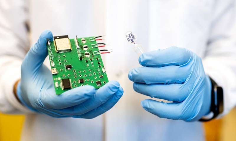 該設(shè)備使用電化學(xué)傳感器,該傳感器由一種特殊材料組成,上面印有與覆蓋SARS-CoV-2病毒的蛋白質(zhì)的冠狀結(jié)構(gòu)相同的形狀和大小的空腔。