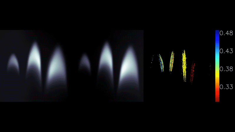 圖片顯示了金屬深度傳感器實(shí)時(shí)工作,以捕獲透明蠟燭火焰的深度。左側(cè)的兩個(gè)圖像是在相機(jī)傳感器上捕獲的原始圖像。它們由金屬元素形成,并且模糊程度略有不同。研究人員從這兩幅圖像中實(shí)時(shí)計(jì)算出物體的深度。右圖顯示了計(jì)算出的深度圖。圖片來源:郭琦和石柱君/哈佛大學(xué)