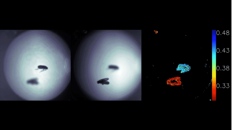 視頻顯示了金屬化深度傳感器實(shí)時(shí)工作以捕獲果蠅的深度。左側(cè)的兩個(gè)圖像是在相機(jī)傳感器上捕獲的原始圖像。它們由金屬元素形成,并且模糊程度略有不同。研究人員從這兩幅圖像中實(shí)時(shí)計(jì)算出物體的深度。右圖顯示了計(jì)算出的深度圖。圖片來源:郭琦和石柱君/哈佛大學(xué)