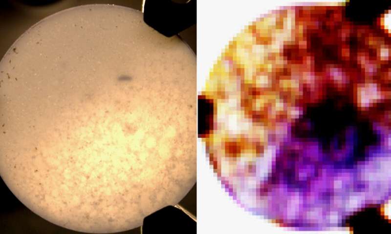 一項新的成像技術(shù)可快速測量固體的化學(xué)成分。樣品藥丸的常規(guī)圖像顯示在左側(cè)。在右側(cè),以太赫茲頻率觀察同一表面會發(fā)現(xiàn)各種成分具有不同的顏色。這樣的圖像將有助于藥品制造中的質(zhì)量控制和開發(fā),以及醫(yī)學(xué)診斷和治療。圖片來源:Sterczewski等。