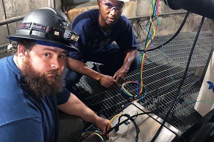 NIST的Joey Boyd(左)和Aaron Johnson在發(fā)電廠進(jìn)行了新傳感器的測(cè)試。平臺(tái)使他們可以進(jìn)入煙囪,該平臺(tái)位于地面上方約45米處。圖片來(lái)源:Tom Martz / EPRI