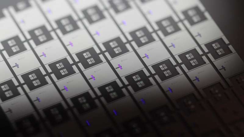 量子電路實(shí)驗(yàn)中使用的聲波器件的陣列。明亮的紫色部分是設(shè)備的活動(dòng)部分。圖片來源:凱文·薩辛格(Kevin J. Satzinger)