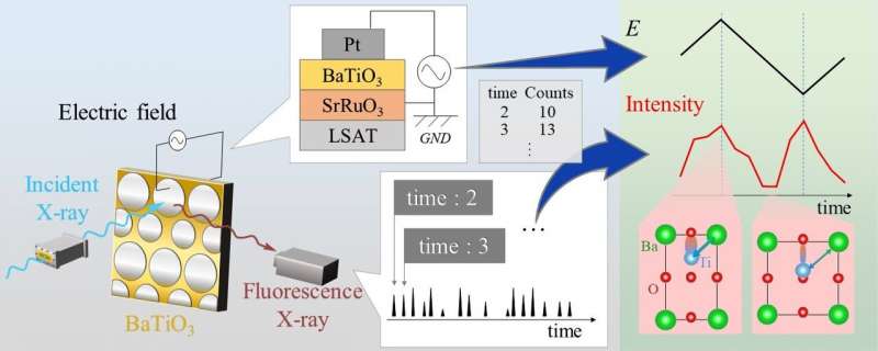來自BaTiO_3薄膜的熒光X射線由帶有時間標記信息的固態(tài)檢測器檢測,該時間標記信息與薄膜上的施加電壓同步以獲得光譜的時間變化。圖片來源:廣島大學(xué)中島信男