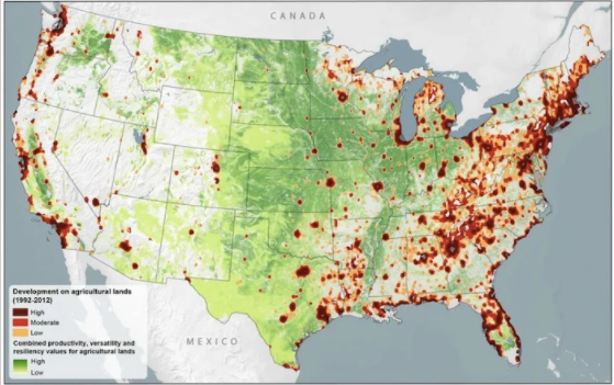 描述 1992 年至 2012 年間農(nóng)業(yè)用地如何轉(zhuǎn)變?yōu)槌鞘泻妥≌_發(fā)項(xiàng)目。圖片由美國農(nóng)田信托基金和現(xiàn)代農(nóng)民提供