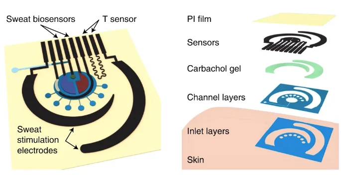 用于采樣和生物傳感的微流體汗液傳感貼片的層組裝示意圖。圖片(修改)由Nature 和 Wang 等人提供