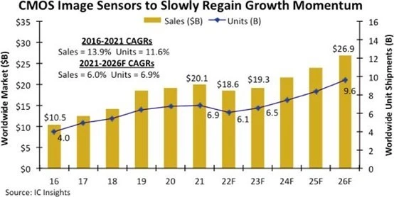 手機(jī)市場(chǎng)在為圖像傳感器市場(chǎng)帶來(lái)豐厚營(yíng)收的同時(shí),也讓圖像傳感器行業(yè)不得不面臨智能手機(jī)需求疲軟的壓力。根據(jù) Counterpoint 的預(yù)測(cè),2022 年上半年移動(dòng)圖像傳感器的出貨量將同比下降 14% (Yole 的數(shù)據(jù)則為 10%)。同時(shí),IC insights 更表示受到手機(jī)市場(chǎng)的需求不足的影響,在 2022 年,整個(gè)圖像傳感器營(yíng)收可能迎來(lái) 13 年來(lái)的首次下跌。