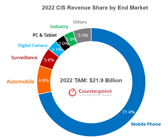 自從 20 多年前手機(jī)開(kāi)始搭載相機(jī)模組以來(lái),智能手機(jī)憑借著驚人的出貨量,逐漸成為圖像傳感器的頭號(hào)用戶。根據(jù) Counterpoint 今年的預(yù)測(cè)數(shù)據(jù),在 2022 年圖像傳感器的總營(yíng)收中有高達(dá) 71.4% 是由手機(jī)貢獻(xiàn)的。