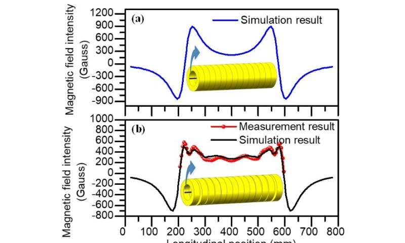 根據(jù)釹鐵硼(NdFeB)永磁環(huán)的磁場(chǎng)分布特征,他們以非等距形式組合了14個(gè)相同的釹鐵硼永磁環(huán),在380 mm的長(zhǎng)度上獲得了平均磁場(chǎng)強(qiáng)度為346高斯的靜態(tài)磁場(chǎng)。通過(guò)將Herriott電池同軸擬合到永磁體陣列上,線性偏振光與樣品之間的相互作用大大增強(qiáng)。