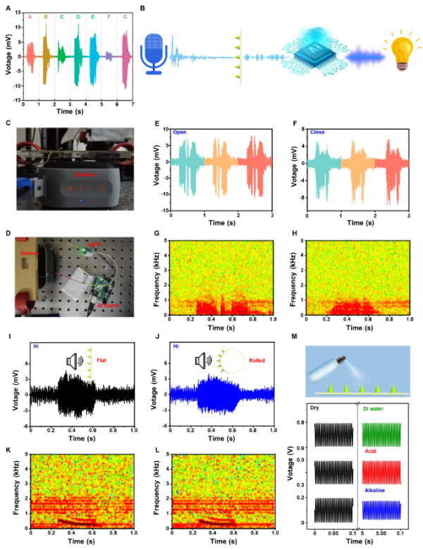 圖1 微錐陣列柔性壓電聲敏器件應用演示圖