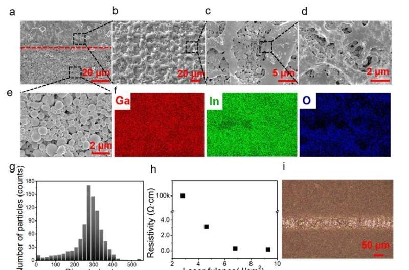 柔性濕度傳感器的表征。具有激光燒結(jié)和(a,e)的GWLM(a-d)的SEM圖像。(f) Ga、In和O分布的EDX圖像。(g) PI薄膜上未燒結(jié)的GWLM顆粒的直徑尺寸分布直方圖。(h) 不同激光通量下激光感應(yīng)導(dǎo)電GWLM路徑的電阻率。(i) 激光通量為9.4 J/cm2時(shí)燒結(jié)LM路徑的最小分辨率。(j)-(l) GA原理圖2O3基于/LM的濕度傳感器,具有各種制造參數(shù)(即電極的寬度和長(zhǎng)度,紫外激光通量)(頂部)。Ga的循環(huán)測(cè)量2O3基于 /LM 的濕度傳感器,通過周期性地將濕度從 30% RH 更改為 95% RH(底部)。學(xué)分:光電進(jìn)展(2023 年)。DOI: 10.29026/oea.2023.220172