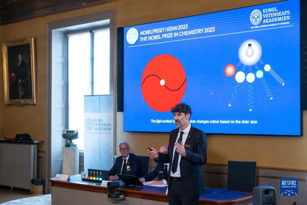 10月4日,在瑞典斯德哥爾摩的2023年諾貝爾化學(xué)獎公布現(xiàn)場,評委會專家解讀今年諾貝爾化學(xué)獎得主的研究成果。新華社發(fā)(魏學(xué)超 攝)