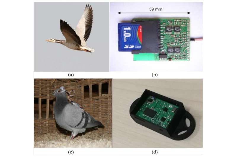 (a) 大型候鳥,斑頭雁,在飛行中。(b) 神經(jīng)記錄器:收集鴿子腦電信號(hào)和GPS位置信息,并將其記錄在SD卡上[7]。(c) 安裝在信鴿頭部和背部的神經(jīng)記錄器。(d) 鳥類可穿戴生物記錄儀收集有關(guān)心率、血氧飽和度、加速度、磁場、氣壓和溫度的信息。圖片來源:電子(2023 年)。DOI: 10.3390/electronics12204373