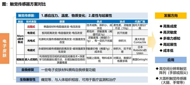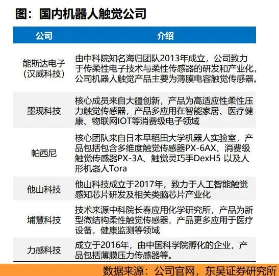 目前機(jī)器人觸覺傳感器市場主要由美國企業(yè)占據(jù)。根據(jù)QY Research,2022年全球前五大廠商占據(jù)76%份額,分別為美國Tekscan、Pressure Profile Systems、Sensor Products、德國Weiss Robotics、美國Syn Touch。國內(nèi)企業(yè)規(guī)模尚小,其中漢威科技子公司能斯達(dá)主要生產(chǎn)薄膜電容觸覺傳感器,可應(yīng)用于機(jī)器人身體,產(chǎn)品成熟;初創(chuàng)型公司帕西尼致力于用列陣式柔性觸覺傳感器應(yīng)用于機(jī)器人領(lǐng)域,技術(shù)積累相對扎實;此外墨現(xiàn)科技、他山科技、埔慧科技、力感科技也有相關(guān)布局。