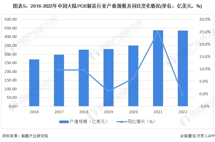 2016-2022年,中國PCB產(chǎn)值規(guī)模整體呈現(xiàn)波動(dòng)上漲的態(tài)勢。2021年,由于需求復(fù)蘇、技術(shù)要求升級以及原材料價(jià)格大幅度上漲等因素影響,推動(dòng)中國PCB產(chǎn)值強(qiáng)勁增長。2022年,中國PCB產(chǎn)值規(guī)模達(dá)到435.5億美元(按照美元口徑),同比下降0.7%。