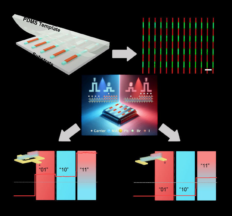 光電邏輯器件因高速信息傳輸、高帶寬和低功耗等優(yōu)勢被認(rèn)為是下一代邏輯電路的理想模型。得益于鈣鈦礦材料的可調(diào)帶隙和溶液處理等優(yōu)勢,鈣鈦礦異質(zhì)結(jié)構(gòu)可以對不同波長入射光產(chǎn)生差異化的光電響應(yīng)信號,并可與印刷技術(shù)兼容,具有低成本和大規(guī)模制造等優(yōu)點,可用于制備光電邏輯器件。然而,目前的光電邏輯器件通常由兩個以上的異質(zhì)結(jié)構(gòu)堆疊而成,但復(fù)雜的構(gòu)型和制造工藝限制了其集成和應(yīng)用。