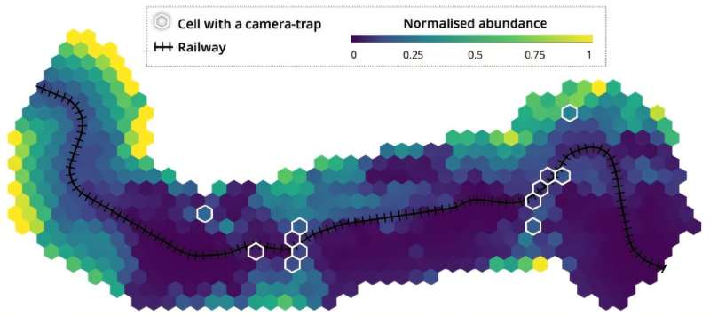 顯示鐵路路段沿線物種估計(jì)相對(duì)豐度的地圖示例。豐度越高,碰撞風(fēng)險(xiǎn)就越高。信用:TerrOïko