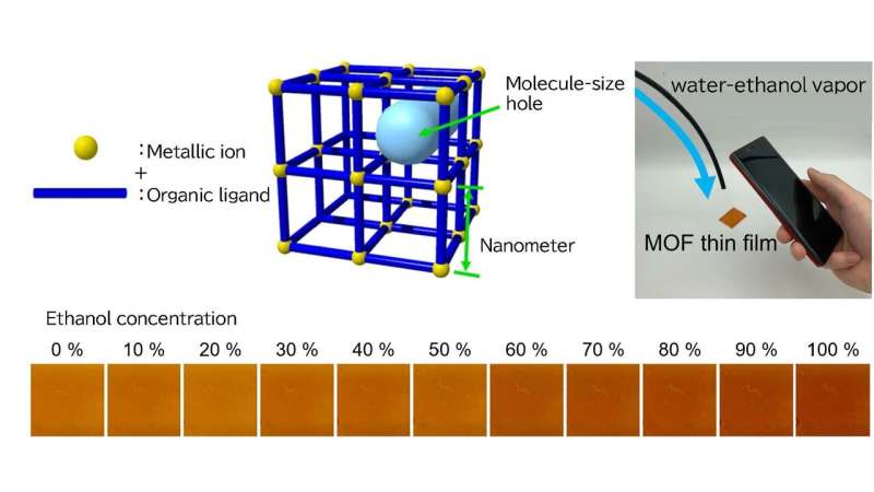 這些金屬有機(jī)框架(MOF)含有納米級孔隙,可吸收乙醇分子并通過可見的顏色變化作出響應(yīng) —— 這一現(xiàn)象被稱為溶劑化 / 蒸氣致色效應(yīng)。得益于低光散射特性和高透明度,Cu-MOF-74 薄膜無需復(fù)雜實(shí)驗(yàn)室設(shè)備即可實(shí)現(xiàn)精確光學(xué)測量。