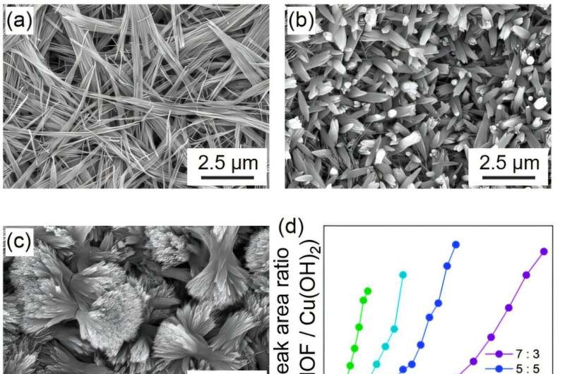 a–c)薄膜的掃描電子顯微鏡(SEM)圖像;(a)Cu (OH)₂納米帶,(b)在甲醇中合成的 Cu-MOF-74 薄膜,(c)在 DMF:MeOH = 3:7 中合成的 Cu-MOF-74 薄膜。d)MOF 譜帶(1556 cm⁻¹)的峰面積。圖片來源:《Small Science》(2025)。DOI: 10.1002/smsc.202400634