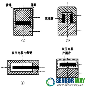 鐵電雙壓電晶片的加速度傳感器常常是彎曲型的,如圖5 (d)所示,它采用一個懸臂元件。加速度通常是施于雙壓電晶 片的平面上,而且除了雙壓電晶片的自重外一般沒有慣性質(zhì) 量。把這種設(shè)計進行改進,把晶片固定到一個薄金屬圓盤上, 中心用螺栓支承,該結(jié)構(gòu)已被成功地使用了。在加速度作用下 晶片撓曲像一把張開的傘如圖5(h)。
