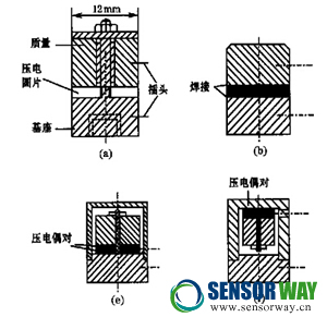 寬頻段微型加速度傳感器,是把鈦酸鋇圓晶片放在傳感器 底座和慣性質(zhì)量之間,并用夾緊的方法安裝起來,如圖5(a)。 近代,F(xiàn)arnborough皇家航空飛行器研究中心生產(chǎn)了一種焊接結(jié) 構(gòu)傳感器,并用包鋅的環(huán)氧樹脂外罩來防潮和靜電屏蔽如圖5 (b)和圖5(c)。但是對這種外罩能顯著地增加阻尼的希望未 能奏效。若采用圖5(d)所示的管狀元件和圖5(f)所示的倒置 型,則可避免底部結(jié)構(gòu)中的應(yīng)變直接傳遞到敏感元件上去。