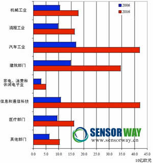 瑞士咨詢公司INTECHNO CONSULTING《2016年傳感器市場》報告顯示,2006年全球民用傳感器市場規(guī)模為816億歐元,2011年為1194億歐元,預計2016年全球民用傳感器市場可達1841億歐元。2006年和2011年間,全球民用傳感器市場年增長率為7.9%,預計2011年到2016年年增長率達9.1%。