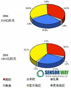 從各國對傳感器的需求看,德國和日本機械行業(yè)的需求最高,尤其是德國傳感器市場整體地位強大,其次是美國的信息和通信業(yè)、流程工業(yè)。在2011年全球傳感器1194億歐元的市場規(guī)模中,西歐占31.8%、東歐占2.8%、北美占28.3%、南美占1.7%、亞太地區(qū)占34.4%,其他地區(qū)占1.0%。圖2是2006年和2016年世界主要地區(qū)民用傳感器的市場份額,從中可以看出,西歐正在逐漸失去傳感器世界市場份額,亞太地區(qū)則呈不斷增長趨勢,主要原因是西歐傳感器買家大多是在機械等傳統(tǒng)行業(yè),在信息和通信技術等領域并不占據(jù)主導地位,而這恰是未來傳感器市場的主要增長領域,近年來中國、印度和東南亞等亞太地區(qū)國家對傳感器的需求則非常強勁。