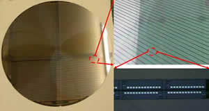 集成電路先導(dǎo)工藝研發(fā)中心與國內(nèi)公司共同建立了微電子所晶圓鍵合聯(lián)合實(shí)驗(yàn)室,致力于MEMS器件的晶圓級(jí)鍵合封裝技術(shù)的開發(fā)。該實(shí)驗(yàn)室開發(fā)的第一套Al-Ge晶圓鍵合封裝技術(shù)的鍵合環(huán)寬度僅有70um,其鍵合強(qiáng)度已超過70MPa、漏率小于5.0x10-3Pa·cm3/s(圖1和圖2分別為劃片前的晶圓照片和切割后的產(chǎn)品照片),該產(chǎn)品FT成品率(如圖3所示)優(yōu)于97%,與國際知名半導(dǎo)體代工廠所生產(chǎn)的同類產(chǎn)品指標(biāo)相當(dāng),達(dá)到國際一流水平。