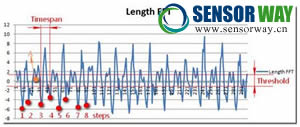 人體最快的跑步頻率為5HZ,也就是說相鄰兩步的時間間隔的至少大于0.2秒,如圖所示,我們設(shè)置了timespan在記步過程中我們過濾了高頻噪聲,即步頻過快的情況。同時我們通過和上次加速度大小進(jìn)行比較,設(shè)置設(shè)立一定的閥值Threshold來判斷運(yùn)動是否屬于有效,有效運(yùn)動才可進(jìn)行記步。
