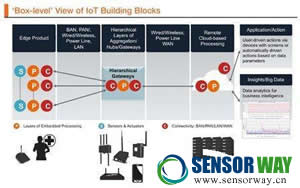 如果我們將IoT的標(biāo)準(zhǔn)模塊從簡單的節(jié)點(diǎn)看作產(chǎn)品,我們得到的將是使用PAN/BAN/LAN類型通信拓?fù)洌B接到采用不同分層結(jié)構(gòu)網(wǎng)關(guān)的傳感節(jié)點(diǎn)/邊緣節(jié)點(diǎn)。這些網(wǎng)關(guān)使用WAN通信技術(shù)與云進(jìn)行通信。