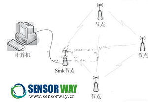 針對(duì)環(huán)境及結(jié)構(gòu)狀態(tài)監(jiān)測(cè),我們?cè)O(shè)計(jì)了一種通用無(wú)線傳感器網(wǎng)絡(luò)硬件平臺(tái),該硬件平臺(tái)由若干傳感器節(jié)點(diǎn)、具有無(wú)線接收功能的Sink節(jié)點(diǎn)及一臺(tái)計(jì)算機(jī)構(gòu)成。無(wú)線傳感器節(jié)點(diǎn)分布于需要監(jiān)測(cè)的區(qū)域內(nèi),執(zhí)行數(shù)據(jù)采集、處理和無(wú)線通信等工作,Sink節(jié)點(diǎn)接收各傳感器的數(shù)據(jù)并以有線的方式將數(shù)據(jù)傳送給計(jì)算機(jī),如圖2所示。