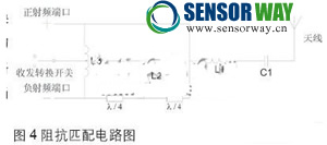 CC2430的射頻信號(hào)采用差分方式,其最佳差分負(fù)載阻抗是115+j180Ω,阻抗匹配電路需要根據(jù)這一數(shù)值進(jìn)行調(diào)整。本設(shè)計(jì)采用50歐姆單極子天線,由于CC2430的射頻端口是差分形式具有兩個(gè)端口,而天線是單端口,因此需要一個(gè)巴倫來(lái)完成兩端口到單端口間的轉(zhuǎn)換。巴倫電路由成本低廉的電感和電容構(gòu)成,如圖4所示,包括電感L1、L2、L3和電容C1和兩段長(zhǎng)的傳輸線。