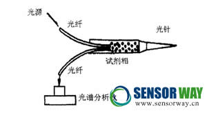 用來(lái)測(cè)定活體組織和血液值pH光纖光譜傳感器示意圖,如圖3所示。其工作原理是利用發(fā)射光、透射光的強(qiáng)度隨波長(zhǎng)的分布光譜來(lái)進(jìn)行測(cè)量。這種傳感器將兩根光纖插入可透過(guò)離子的纖維素膜盒中.膜盒內(nèi)裝有試劑,當(dāng)把針頭插入組織或血管后,體液滲入試劑,導(dǎo)致試劑吸收某種波長(zhǎng)的光.用光譜分析儀測(cè)出此種變化,即可求得血液或組織的pH值。