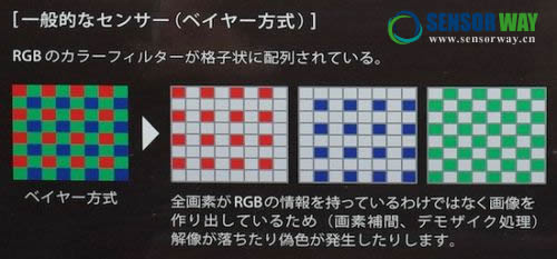 傳統(tǒng)拜耳傳感器的色彩濾波陣列(CFA),設(shè)計在2 X 2像素單元中分別有一個像素的紅色,一個像素的藍色和兩個像素的綠色顏色濾鏡,通過不斷重復(fù)這些單元組成陣列。使用拜耳傳感器的相機必須通過插值的方法填補失去的顏色和亮度信息,這將導(dǎo)致分辨率下降和出現(xiàn)偽色等問題。